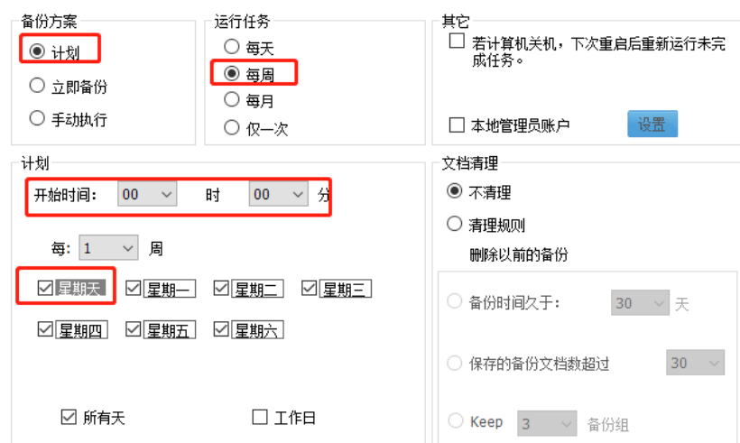 2.点击计划备份之后就进入到设置备份计划的界面了,在这个界面中我们可以设置备份任务运行的时间,可以选择每天、每周或每月执行,然后还有开始时间等参数设置,大家根据自己想要定时备份文件的具体时间来设置即可。