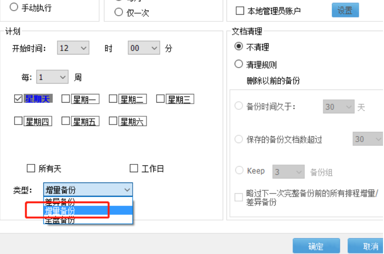 3.设置好定时备份文档的时间之后,在下方的类型这里可以选择备份的类型,有增量备份、差异备份、全盘备份这几种备份类型可以选择。