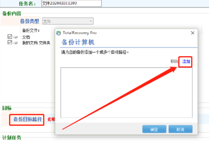 6.点击确定按钮选择好想要备份的文件之后,下一步是选择备份目标路径,点击备份目标路径选项之后在出现的界面中点击添加。