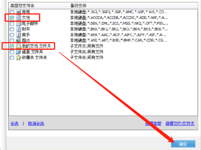 5.紧接着下一步就是需要选择备份的文件类型了,在下图所示的界面中选择想要备份的文件,勾选文档选项之后点击右下角的确定按钮。