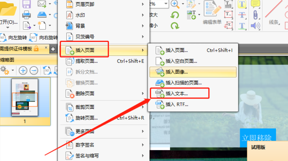3.点击打开将文件成功加载到软件界面之后,我们点击上方的文档这个功能选项,然后选择点击插入页面这个功能,点击插入页面之后选择它后面的插入文本功能。