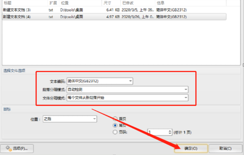6.点击打开按钮之后我们可以在插入文本的界面中就可以看到选择的TXT文件了,然后我们在文件选项中可以对插入的TXT文件进行设置,设置完成之后点击确定按钮即可。