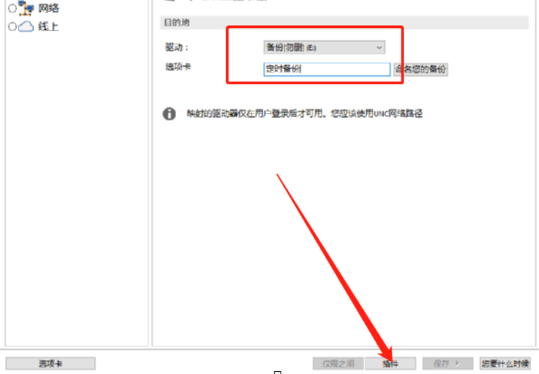 2.点击新建之后需要选择备份文件保存的位置,在下图中框出的位置选择好备份保存的位置以及设置好备份任务的名称之后点击下方的插件按钮。