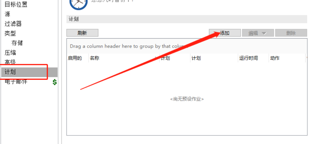 5.点击添加按钮之后就来到添加计划的界面了,也就是计划备份任务什么时候进行的界面,然后我们点击界面中的添加按钮即可添加设置备份时间。