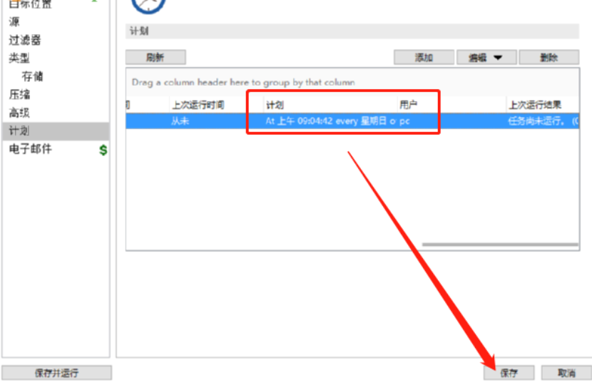 7.设置好定时备份的时间并点击确定之后我们的这个定时备份计划就添加完成了,在计划页面可以看到显示的定时备份时间,然后我们点击保存按钮即可创建这个定时备份任务。