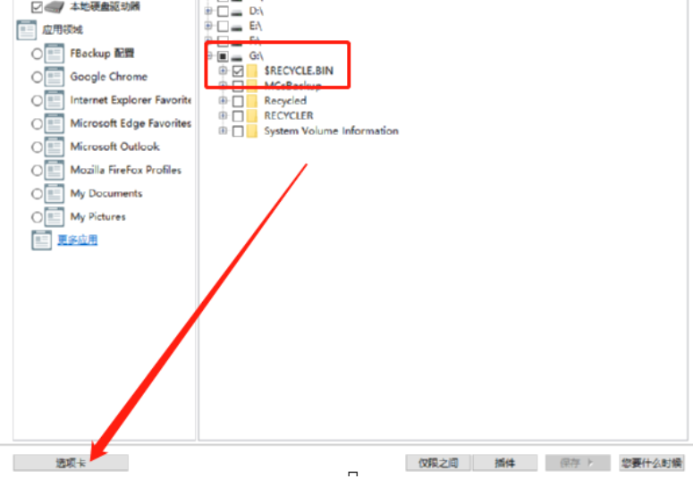 3.点击插件按钮之后会进入到选择备份文件的界面,在界面中我们选择好要备份哪些文件之后点击左下角的选项卡按钮。