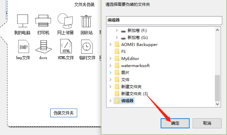 3.点击伪装文件夹按钮之后就会出现一个选择需要伪装的文件夹的界面,在这个界面中我们选中想要伪装的文件夹之后点击确定按钮。
