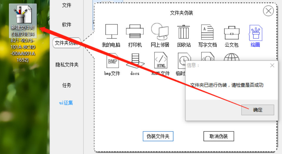 4.最后点击确定按钮软件就会开始伪装这个文件夹了,伪装完成之后会返回一个信息界面,然后我们就可以看到选择伪装的文件夹图标已经变了,如下图中所示,这样就表示伪装成功了。