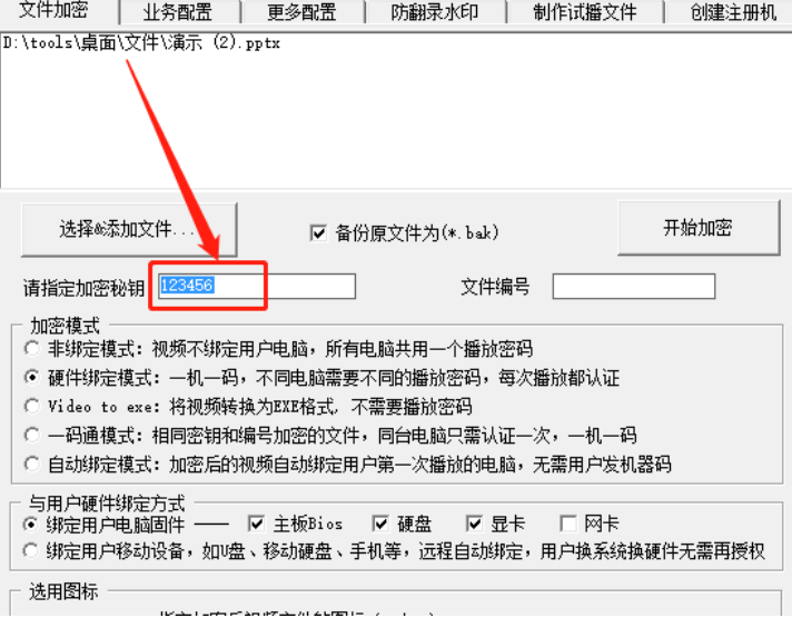 3.点击打开按钮将需要加密的文件添加到软件界面之后,我们就可以设置加密文件的密码了,在“请指定加密秘钥”这个输入框中输入加密密码即可。