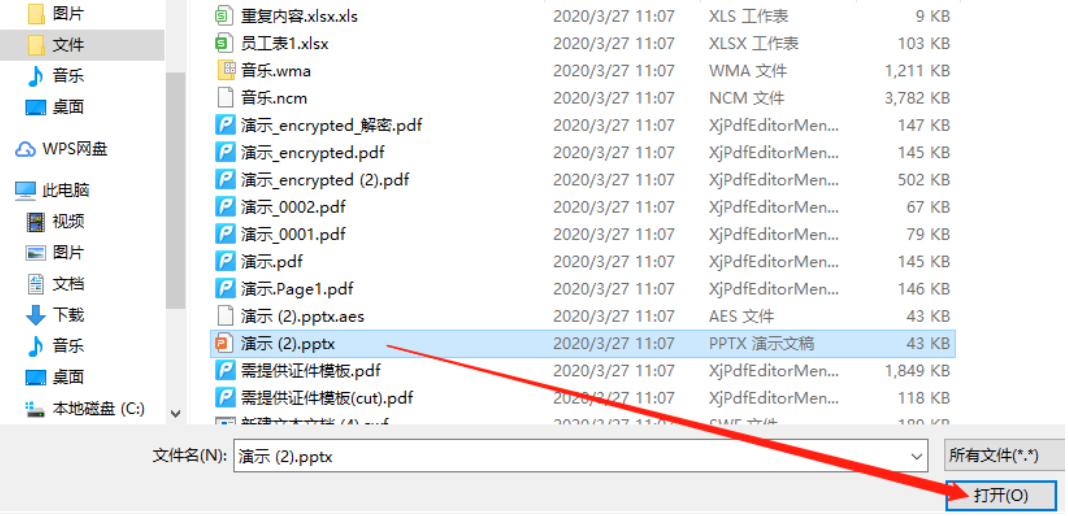 2.点击添加文件之后接下来在选择文件的界面中我们就可以找到自己想要加密的文件了,选中之后点击打开按钮即可。