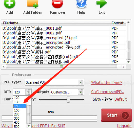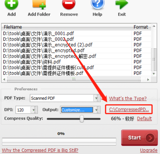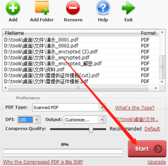 6.最后我们在设置好文件输出路径以及压缩参数之后,点击界面右下角的Start这个开始按钮就可以开始批量压缩PDF文件了。