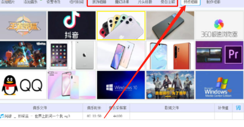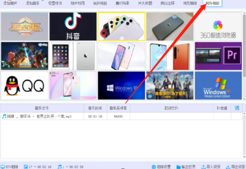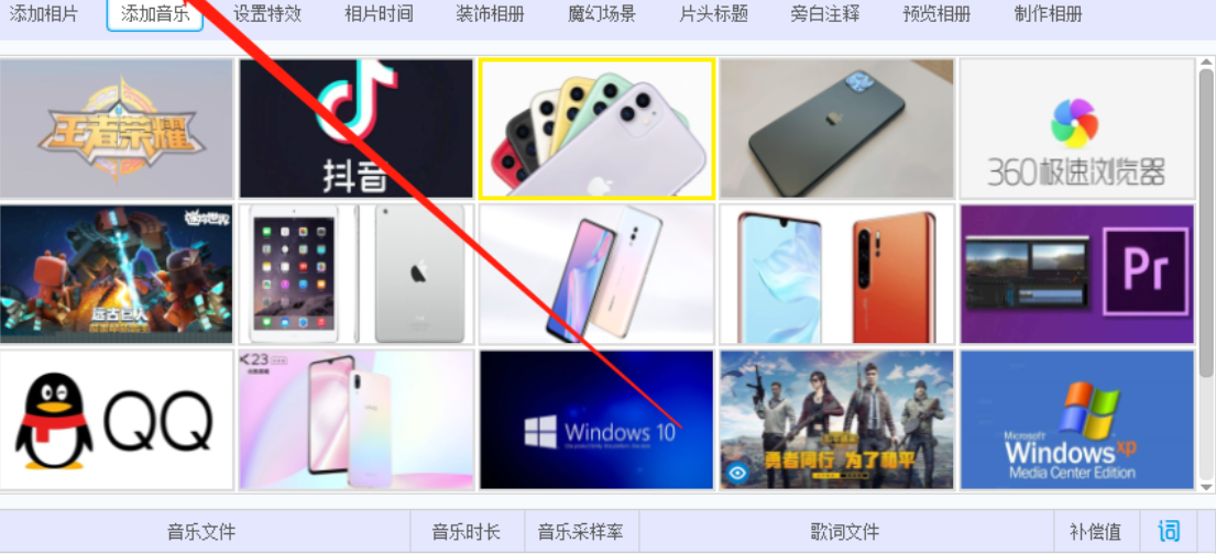 3.点击打开按钮之后我们在软件的主界面中就可以看到添加音乐这个功能按钮了,点击之后可以给相册添加背景音乐。