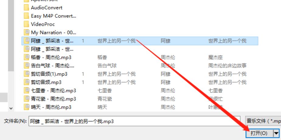 4.点击添加音乐按钮之后会打开一个选择音频文件的界面,我们在这个界面中选中目标音频文件之后点击打开按钮即可。