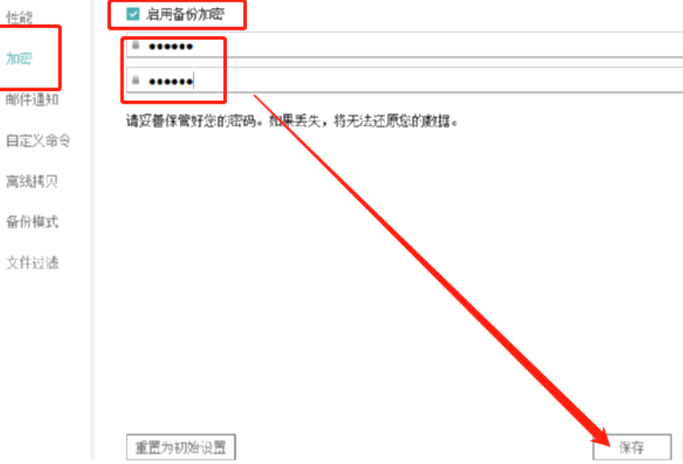 5.点击备份选项之后就打开设置备份的界面了,我们在左侧界面中切换到加密功能中,然后勾选启用备份加密功能,设置好加密备份的密码之后点击右下角的保存按钮。
