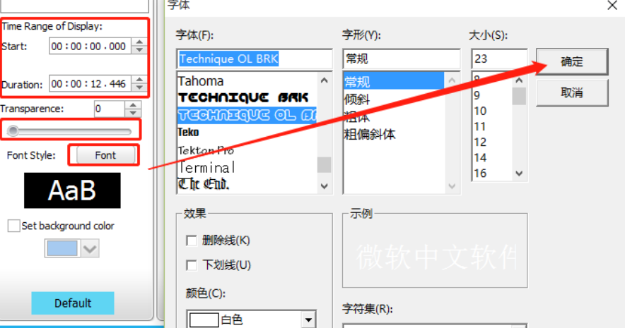 5.输入水印的内容之后可以设置水印出现的时间以及设置水印的透明度,然后点击Font这个按钮可以更改水印文字的样式,大家根据自己的需求设置即可。