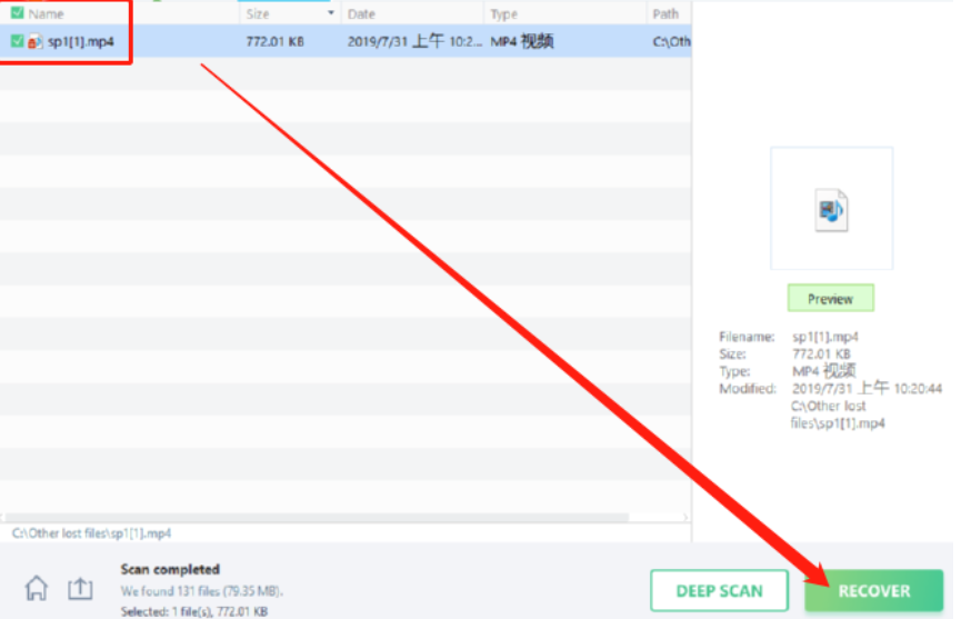 5.等到搜索完成之后我们在搜索结果页面就可以看到我们想要恢复的目标视频文件了,然后我们勾选这个文件的方框点击界面右下角的Recover按钮即可进行恢复。