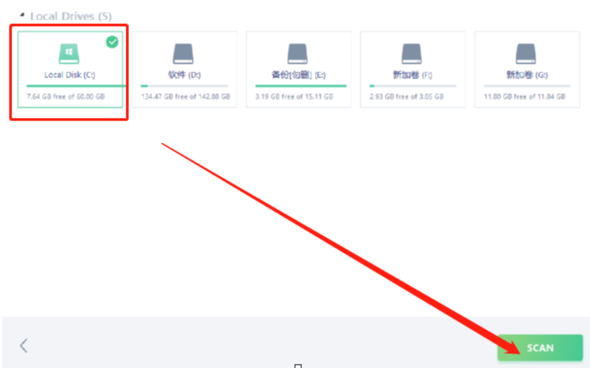 2.紧接着第二步就是选择我们想要扫描恢复视频文件磁盘的界面,也就是选择视频未被删除之前储存的磁盘,选择之后点击Scan按钮即可开始扫描。