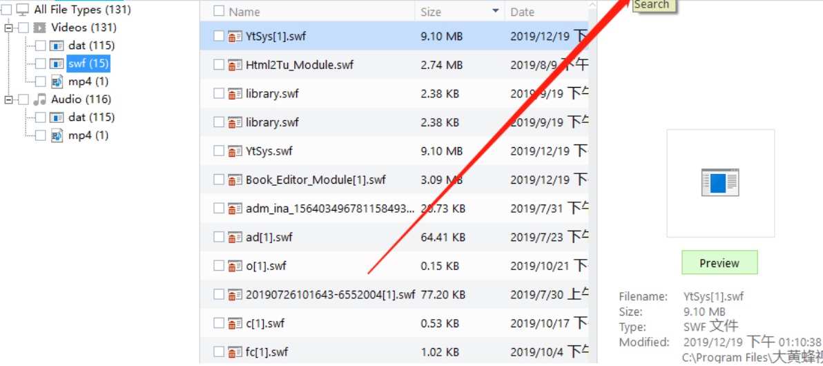 4.如果用户通过上一个步骤没有找到文件的话我们可以在界面右边的搜索框中输入我们想要恢复删除视频的名称关键字,输入之后点击搜索图标即可在扫描出来的文件中进行搜索。