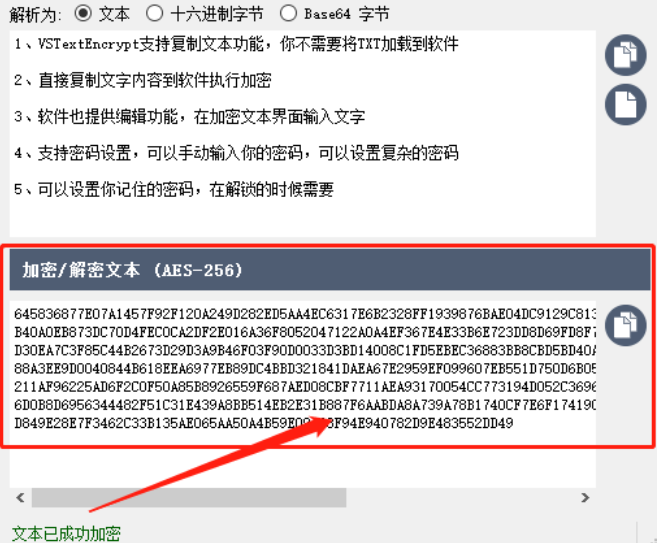 6.输入加密密码点击确定按钮之后软件就会开始加密操作了,等到加密完成之后我们在下方的文本框中即可看到被加密之后的密文,然后我们就可以将密文复制保存到文档中了,别人打开文档时看到的就是加密后的密文。