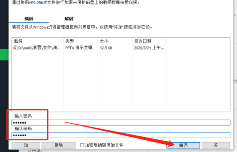 5.点击添加好文件之后,我们在界面下方的输入密码和确认密码这两个输入框中,输入我们想要加密文件的密码之后,点击右下角的编码这个功能按钮即可。