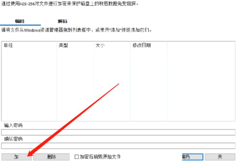 3.进入到加密文件的功能界面之后,下一步就是点击出现的界面左下角的加按钮,点击之后添加需要加密的文件。
