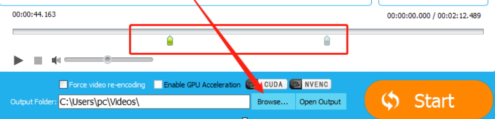5.将文件分割之后我们在视频的进度条中可以看到已经分割之后的视频片段,然后我们点击Browse这个浏览按钮可以选择分割视频的储存位置。