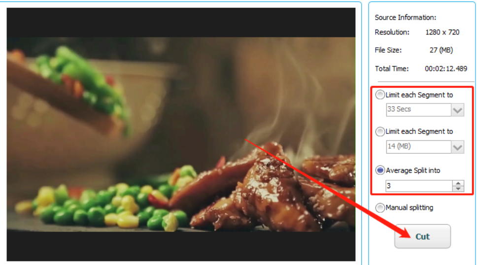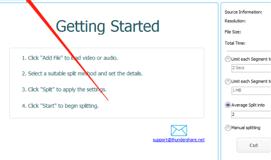 4.点击打开按钮将视频添加进去之后,下一步就是在界面右边设置分割视频的方式了,选择好分割方式之后点击Cut这个功能按钮即可开始分割文件。