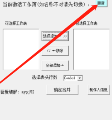 2.打开需要合并的表格文件之后我们点击软件界面右上角的更新这个功能按钮即可开始识别电脑中打开的Excel文件。