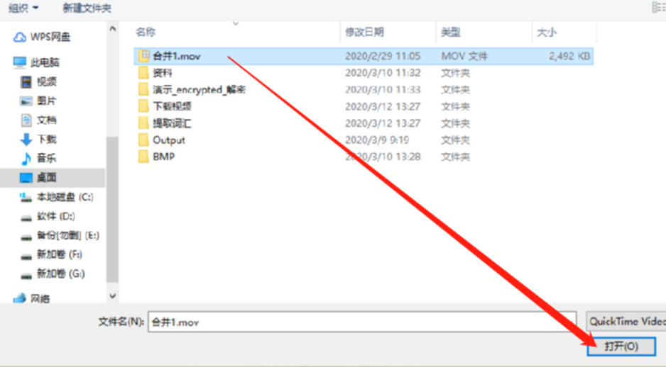 2.点击添加文件按钮之后下一步就是在打开的选择文件界面中选择目标mov视频文件,然后点击右下角的打开按钮。