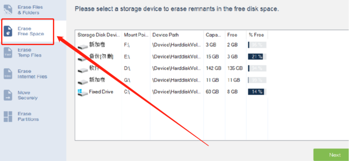 1.首先第一步我们打开软件之后在界面的左边切换到Erase Free Space这个空间清理功能界面中。