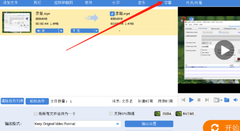 3.点击打开按钮之后视频就成功加载到软件界面中了,然后下一步就是在界面上方点击字幕这个功能。