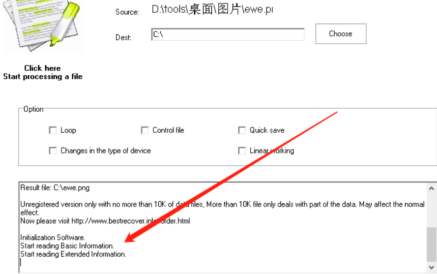 4.点击打开按钮之后软件就会开始修复图片了,在下图中箭头指向的位置可以看到修复图像的一些过程。