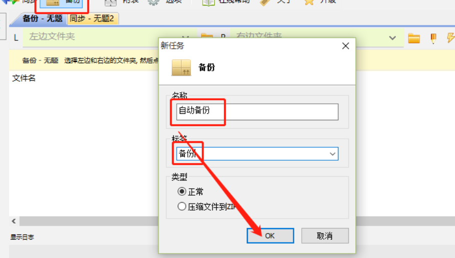 1.首先第一步我们点击打开软件之后在软件左上方点击备份这个功能按钮,然后就会打开一个新建备份任务的界面了,我们输入备份名称和标签点击OK按钮即可。