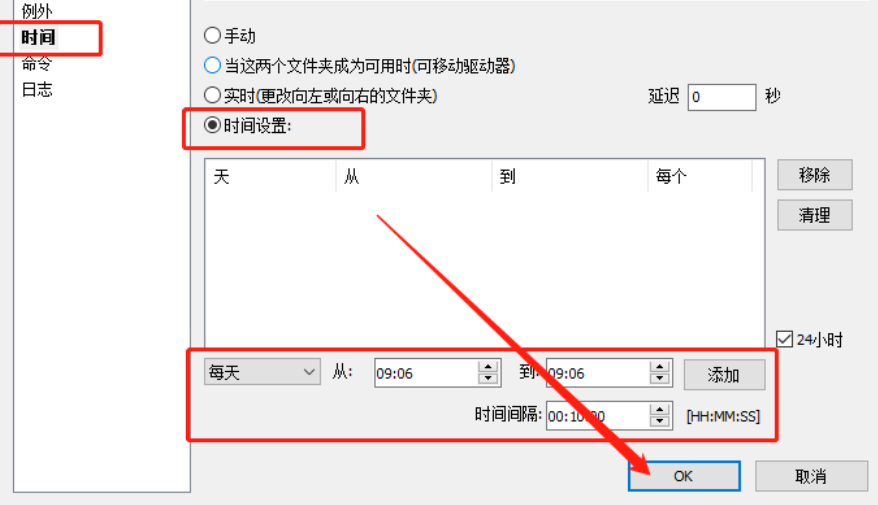 6.点击设定之后打开下图所示的位置,在这个界面左边切换到时间功能设置界面,然后选择时间设置选项,紧接着就可以根据自己的需求在下方选择在什么时间进行自动备份了。
