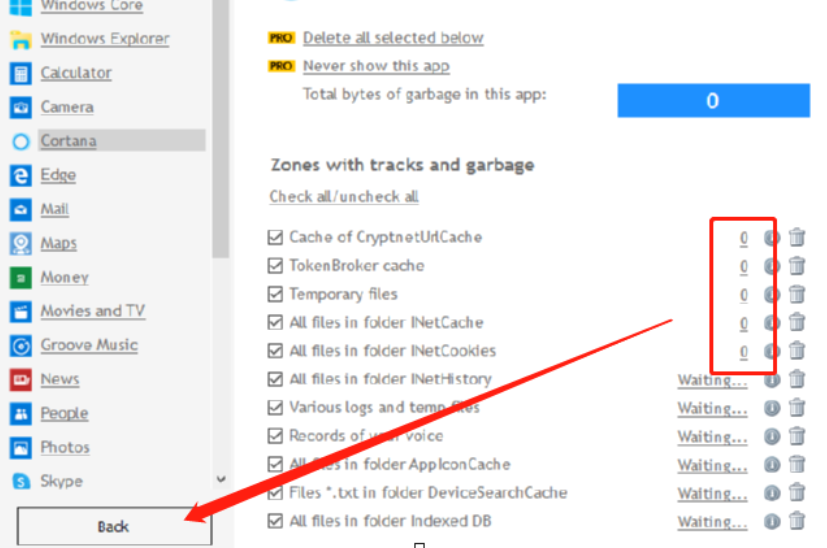 4.点击垃圾桶清理之后垃圾的数量就显示为0了,然后我们点击界面左下角的Back按钮回到扫描垃圾文件的主界面中。