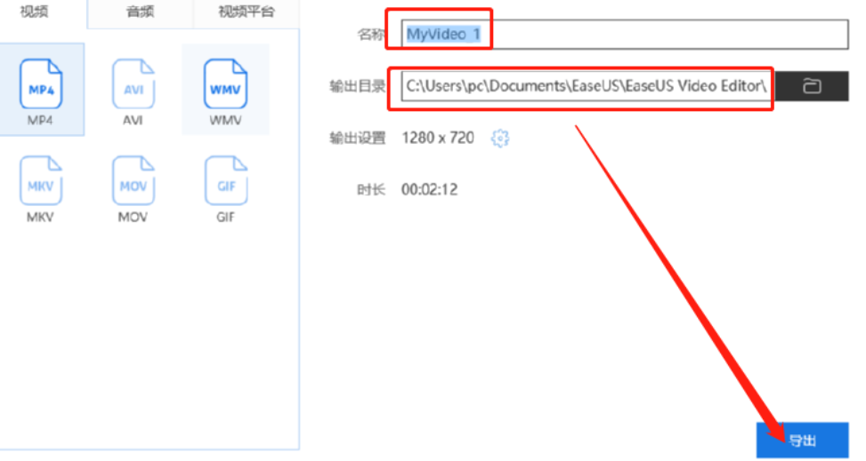 6.点击导出这个功能按钮之后就会来到设置视频导出参数的界面,我们可以选择视频的格式、名称、输出目录等参数,设置完成之后点击右下角导出按钮即可。