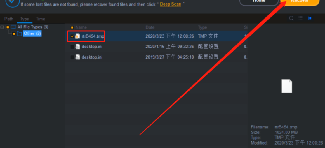 5.我们找到自己想要恢复的文件之后点击勾选这个文件,然后再点击界面右上角的Recover这个恢复按钮就可以开始恢复这个文件了。