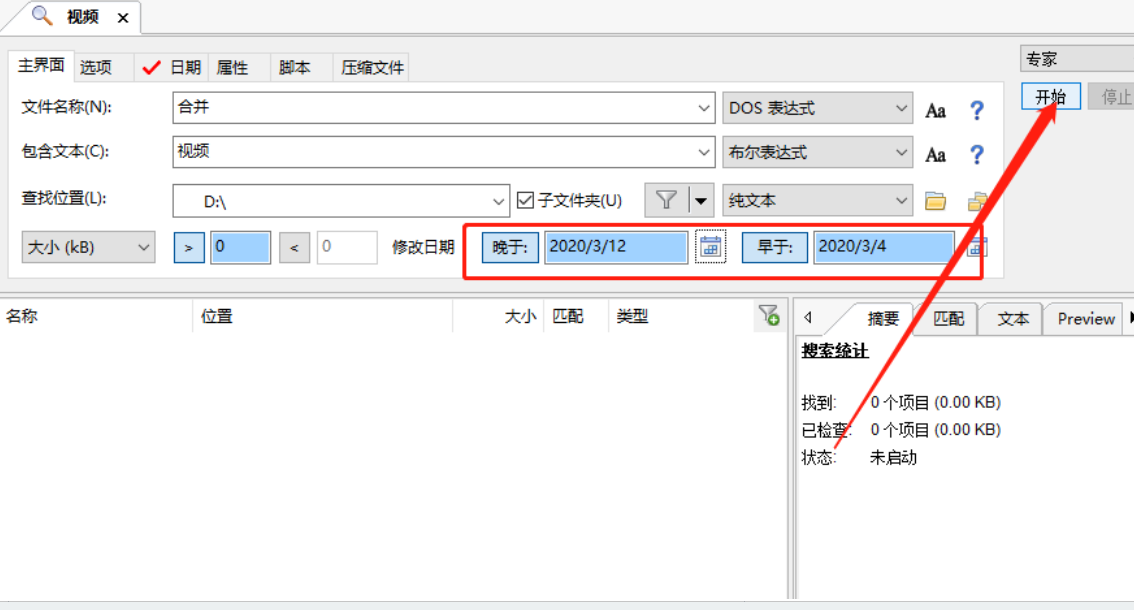 5.选择好查找文件的位置之后可以设置查找文件的修改时间,也就是一些查找文件的条件,设置完成之后点击开始按钮即可。