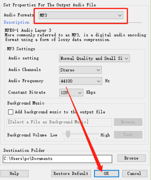 5.最后点击转换成音频之后,在界面中会出现一个设置音频文件参数的窗口,我们设置好音频文件的格式和一些其他参数之后点击OK按钮即可开始转换。