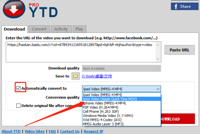 4.设置好视频的下载保存地址之后,我们在下方的转换格式模块中勾选转换功能之后,点击打开下拉列表可以设置视频下载时候需要转换的格式。