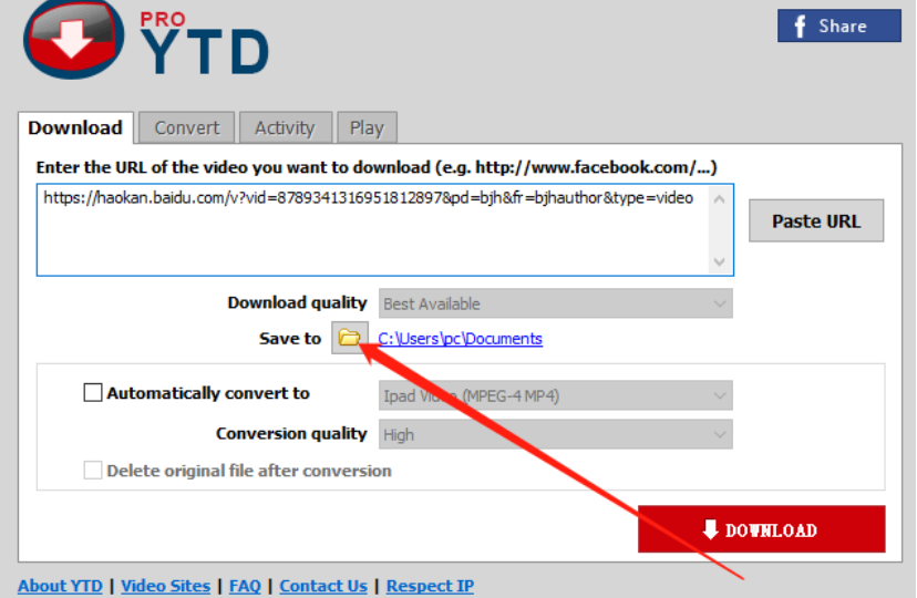 2.我们打开视频所在的网页,将网页链接复制之后粘贴到软件的输入框中,然后点击下方Save to这个选项旁边的文件夹图标。