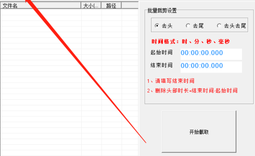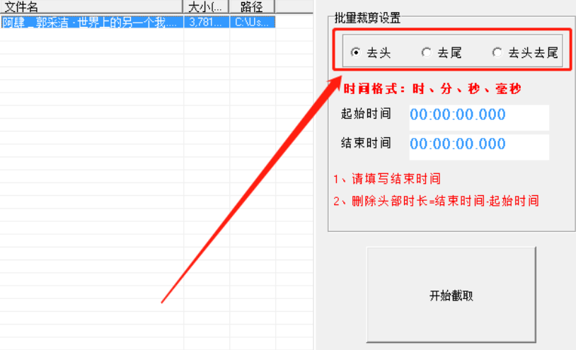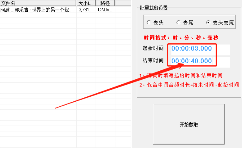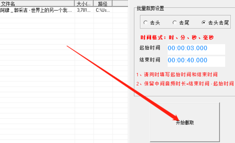 5.设置好想要剪切的音频片段时间之后,下一步我们就可以点击界面右下角的开始截取这个功能按钮来开始截取文件的操作了。