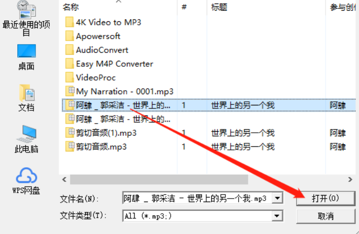 2.点击添加文件的按钮之后紧接着会打开一个选择文件的界面,在这个界面中我们选中目标音频文件之后点击右下角的打开按钮。