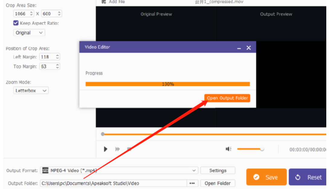6.点击Save按钮之后软件就会开始裁剪视频文件了,等到显示100%之后点击打开输出文件夹按钮即可查看裁剪之后的视频文件。