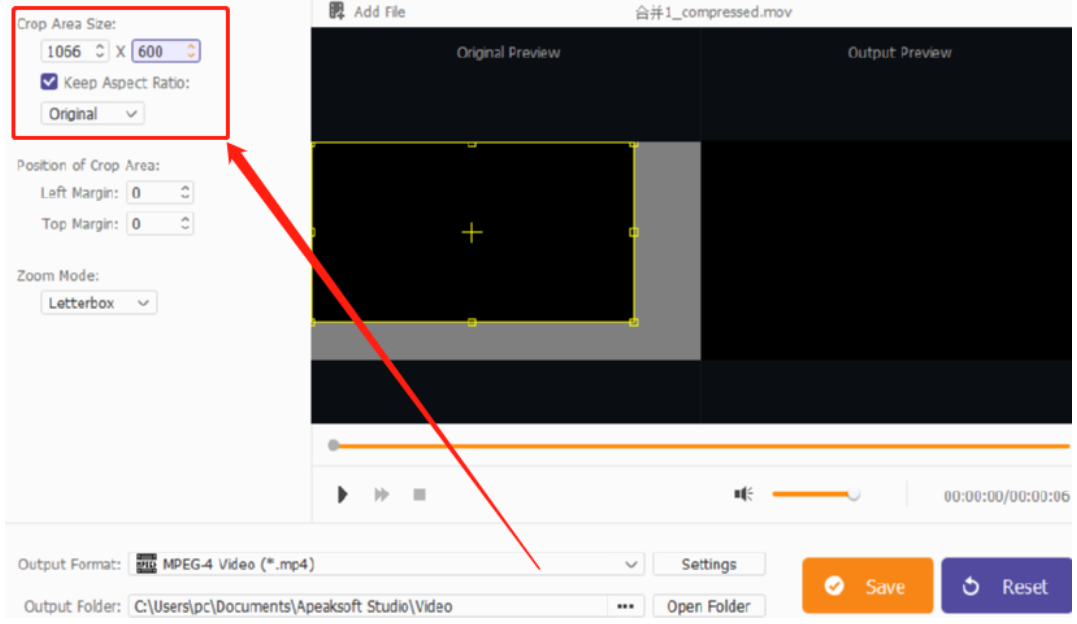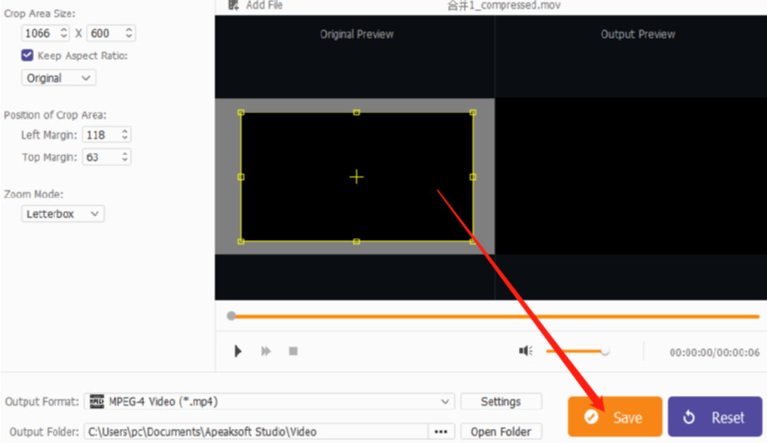 5.设置好尺寸之后我们点击移动设置好的尺寸,在视频的界面中选择裁剪之后的区域,设置完成之后点击下方的Save按钮。