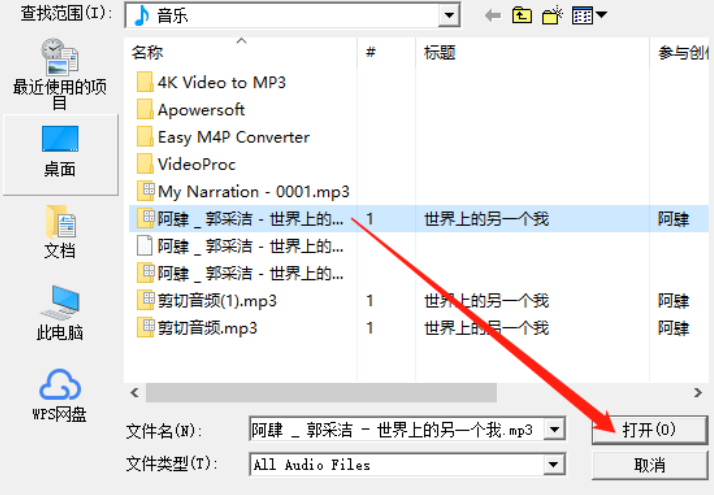 2.点击添加文件选项之后紧接着在出现的选择文件界面中需要选中想要转换的MP3文件,选中之后点击右下角的打开按钮即可。