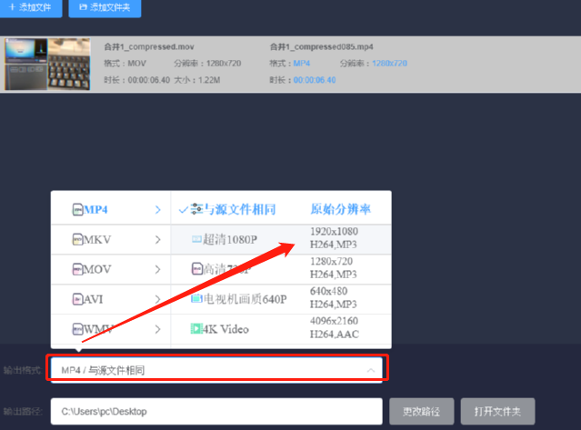 3.将想要转换的文件添加到软件界面之后,下一步在界面下方的输出路径位置就可以选择自己想要转换的视频格式。