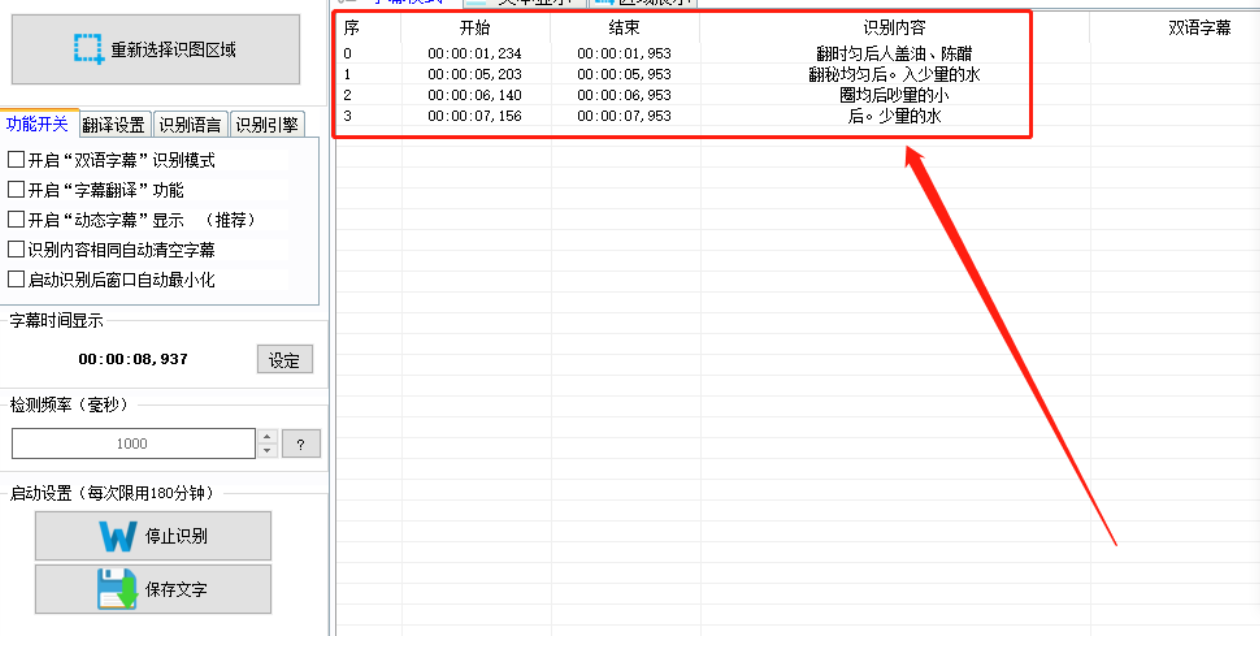 5.开始识别之后我们在界面中就可以看到识别出来的一些字幕了,然后点击界面左下角的保存文字按钮可以将识别出来的字幕给保存下来。
