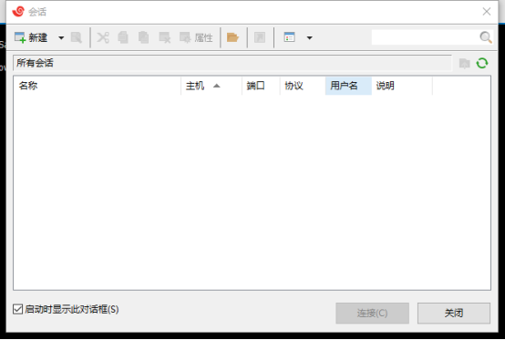这里记载着你的全部会话,可以显示会话的名称、主机、端口号、协议名、用户明、以及说明,如果你下一次不想出现会话对话框你可以去掉启动时显示此对话框不购选启动时显示此对话框就可以了