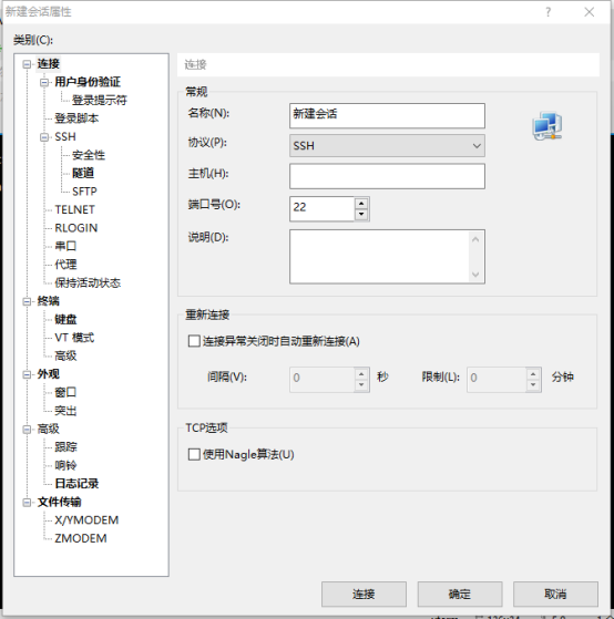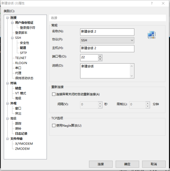 建立连接之后就可以单击确定或者你需要对会话进行设置你可以在如上图所示的新建会话对话框对新建会话进行设置,设置之前你需要对会话进行连接。